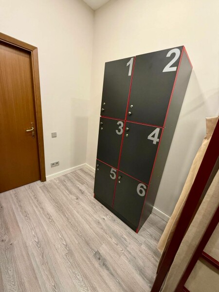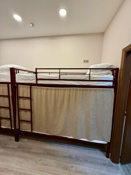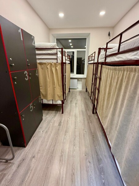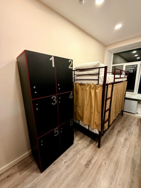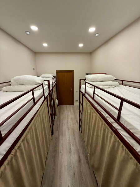 Кровать в мужском шестиместном номере площадью 11 кв.м. Есть доступ к Wi-Fi. Номер звукоизолирован, оснащен централизованной системой вентиляции и кондиционирования. Общая ванная комната и санузел. Также для Гостей доступна оборудованная кухня и прачечная.