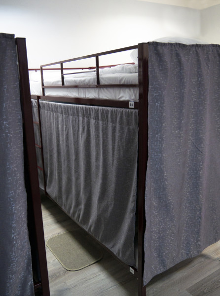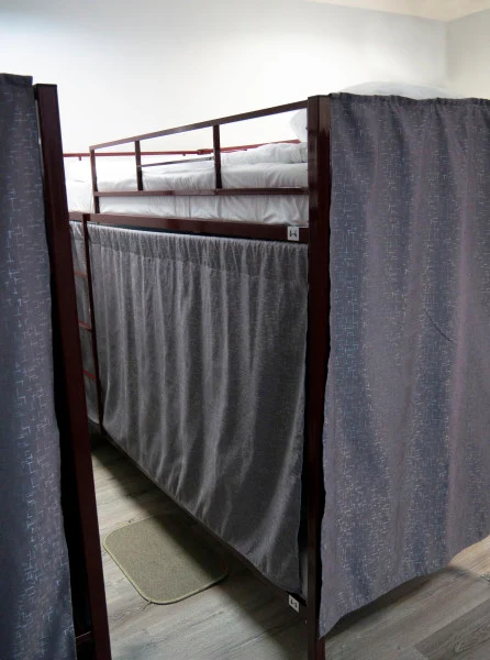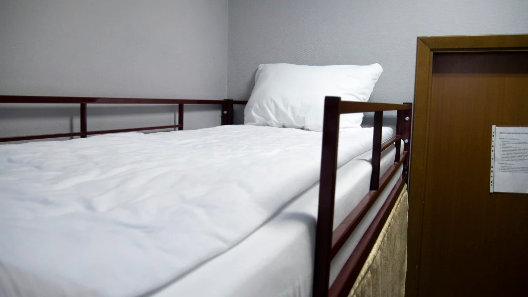 Кровать в мужском шестиместном номере площадью 11 кв.м. Есть доступ к Wi-Fi. Номер звукоизолирован, оснащен централизованной системой вентиляции и кондиционирования. Общая ванная комната и санузел. Также для Гостей доступна оборудованная кухня и прачечная.