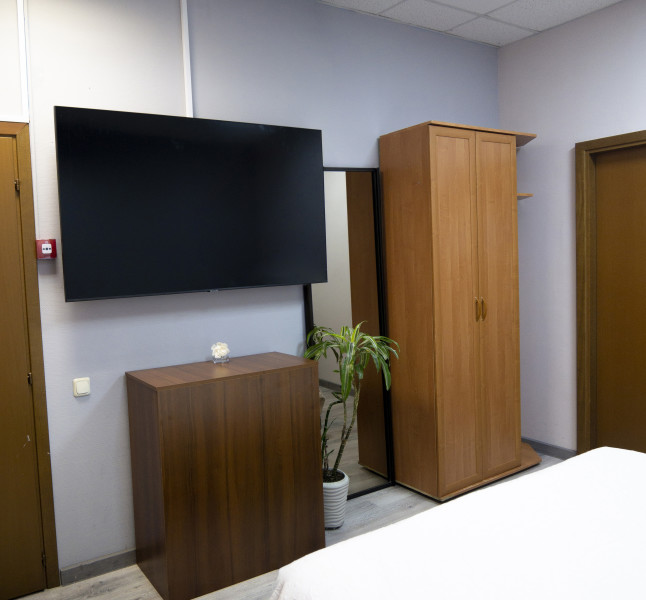 Кровать в мужском шестиместном номере площадью 14 кв.м. Есть доступ к Wi-Fi. Номер звукоизолирован, оснащен централизованной системой вентиляции и кондиционирования. Общая ванная комната и санузел. Также для Гостей доступна оборудованная кухня и прачечная.