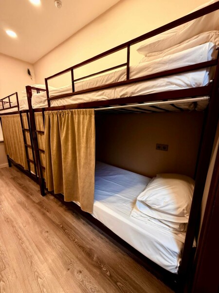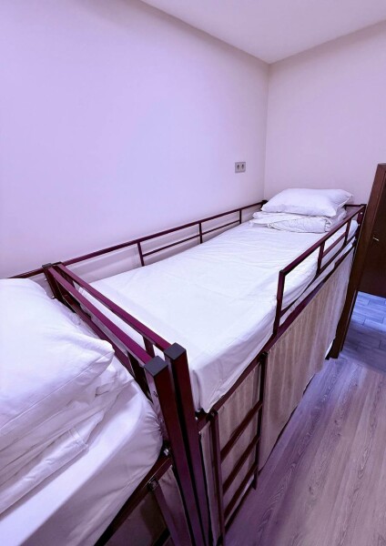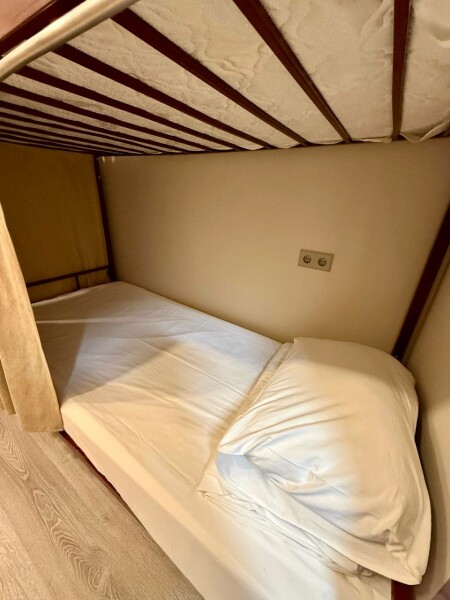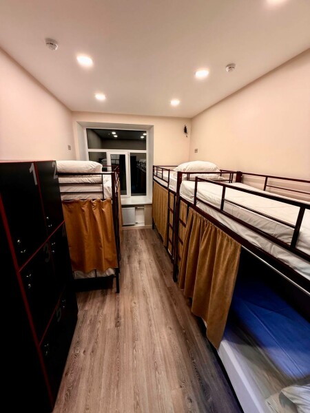 Кровать в мужском шестиместном номере площадью 11 кв.м. Есть доступ к Wi-Fi. Номер звукоизолирован, оснащен централизованной системой вентиляции и кондиционирования. Общая ванная комната и санузел. Также для Гостей доступна оборудованная кухня и прачечная.